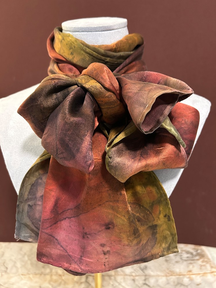 Immerse yourself in the beautiful colors of this eco printed and hand painted silk satin scarf.  Strong colors are the background for exquisite leaf prints that come together for an amazing burst of fall color.