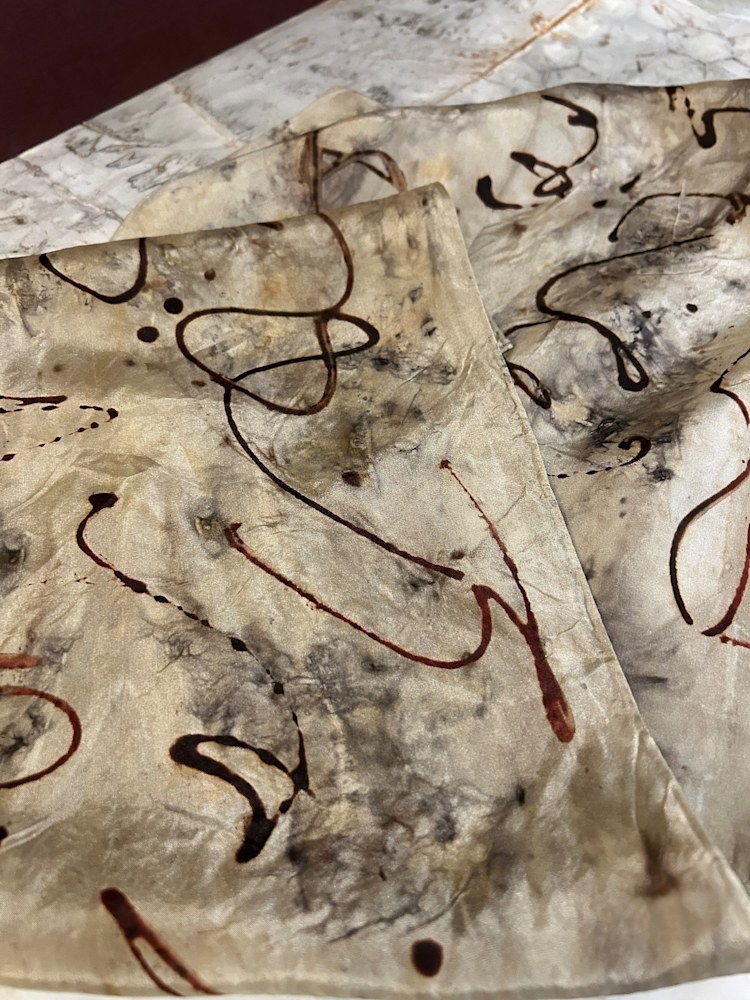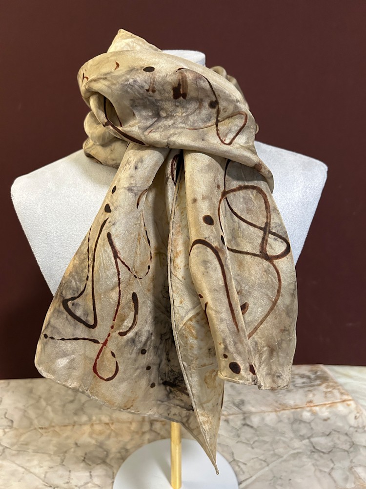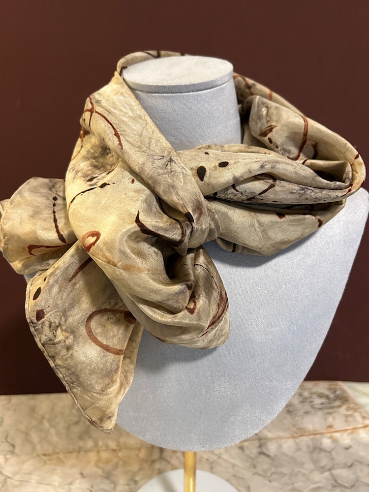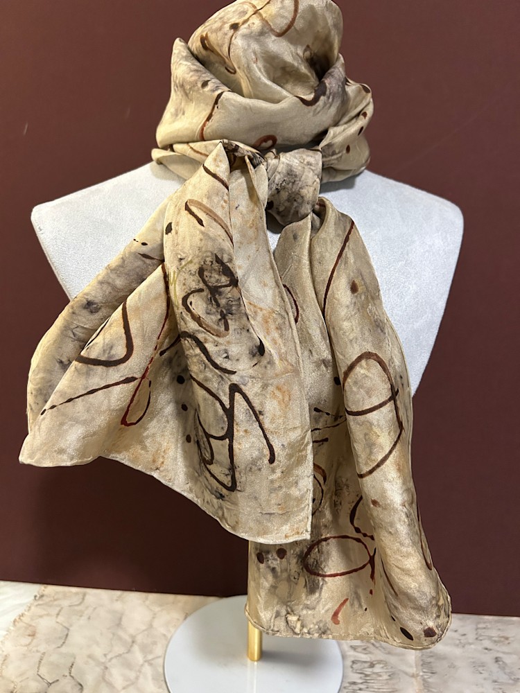Natural colors take center stage on this beautiful eco printed and hand scripted habotai silk scarf.  Light and airy, this beautiful scarf features beautiful brown, gold and grey accents and looks beautiful with many colors and styles.  One of a kind design by Debbie Alley.
