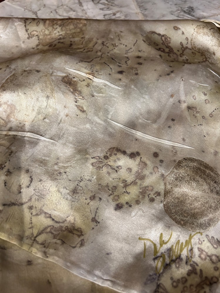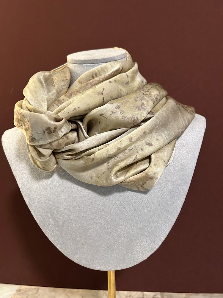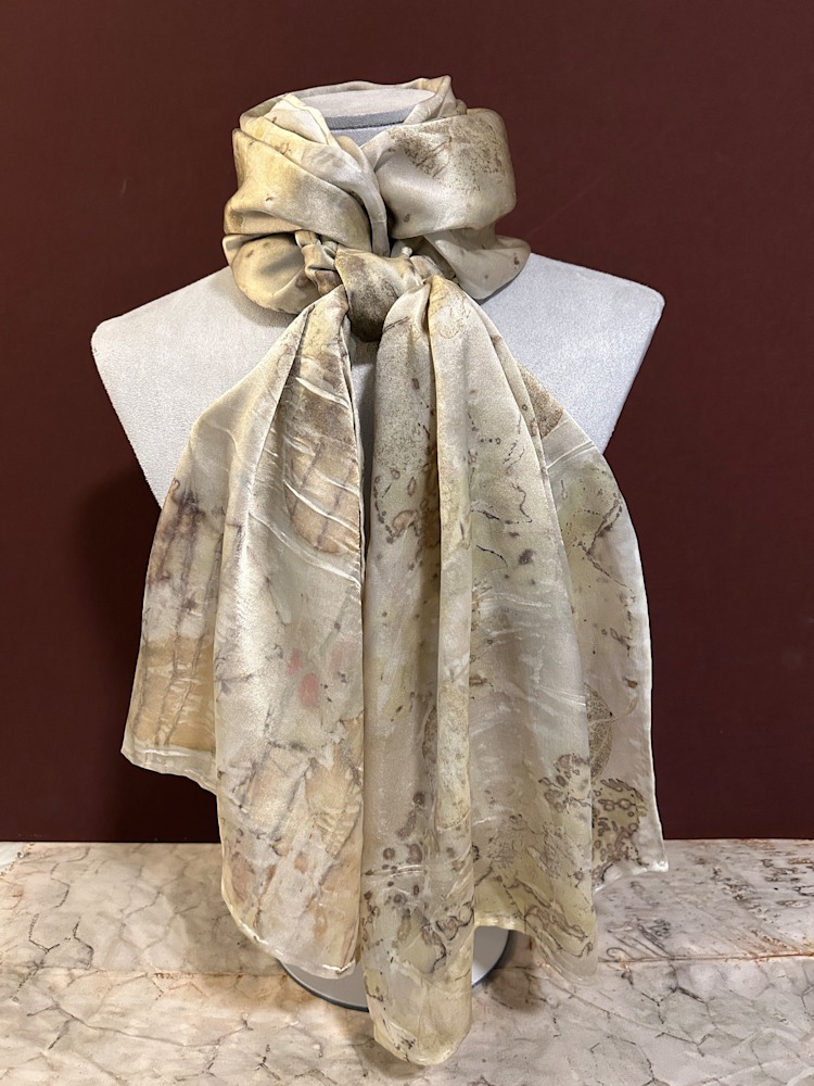 Shimmering silk satin scarf with beautiful accents of gold from eucalyptus leaves printed on the surface.  Wrap yourself in this luxurious scarf and stay warm in style with this nature inspired wearable work of art.