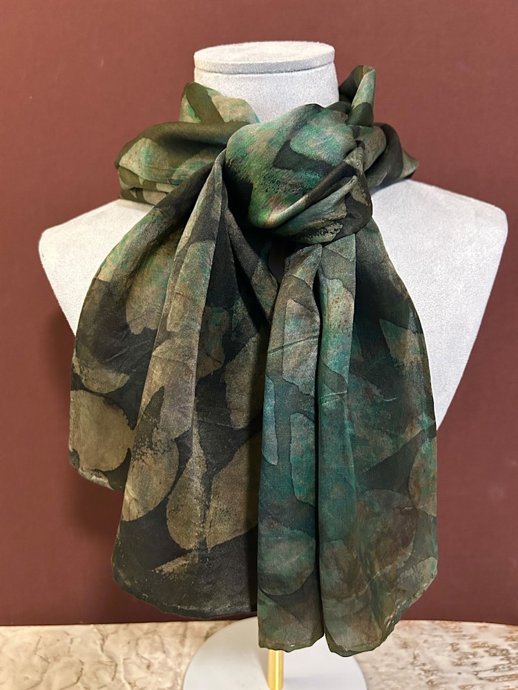 This urban-inspired scarf features a grungy, edgy look with dark green fading into black over an eco-printed base. Its rugged aesthetic and deep, moody tones make it a bold and versatile accessory perfect for adding a touch of street-style sophistication.